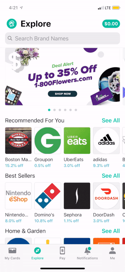 5) Pronto, agora com os gift cards prontos e disponíveis no aplicativo. (Sim eles ficam disponíveis dentro de minutos) faça seu pedido.