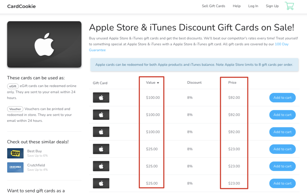 O site CardCookie oferece Gift Cards com desconto, o desconto varia de acordo com a demanda. Por exemplo hoje (data que escrevo esse artigo) o desconto é de 8% , combinando isso com os 3% de cashback do cartão você acumula 11% de desconto total.